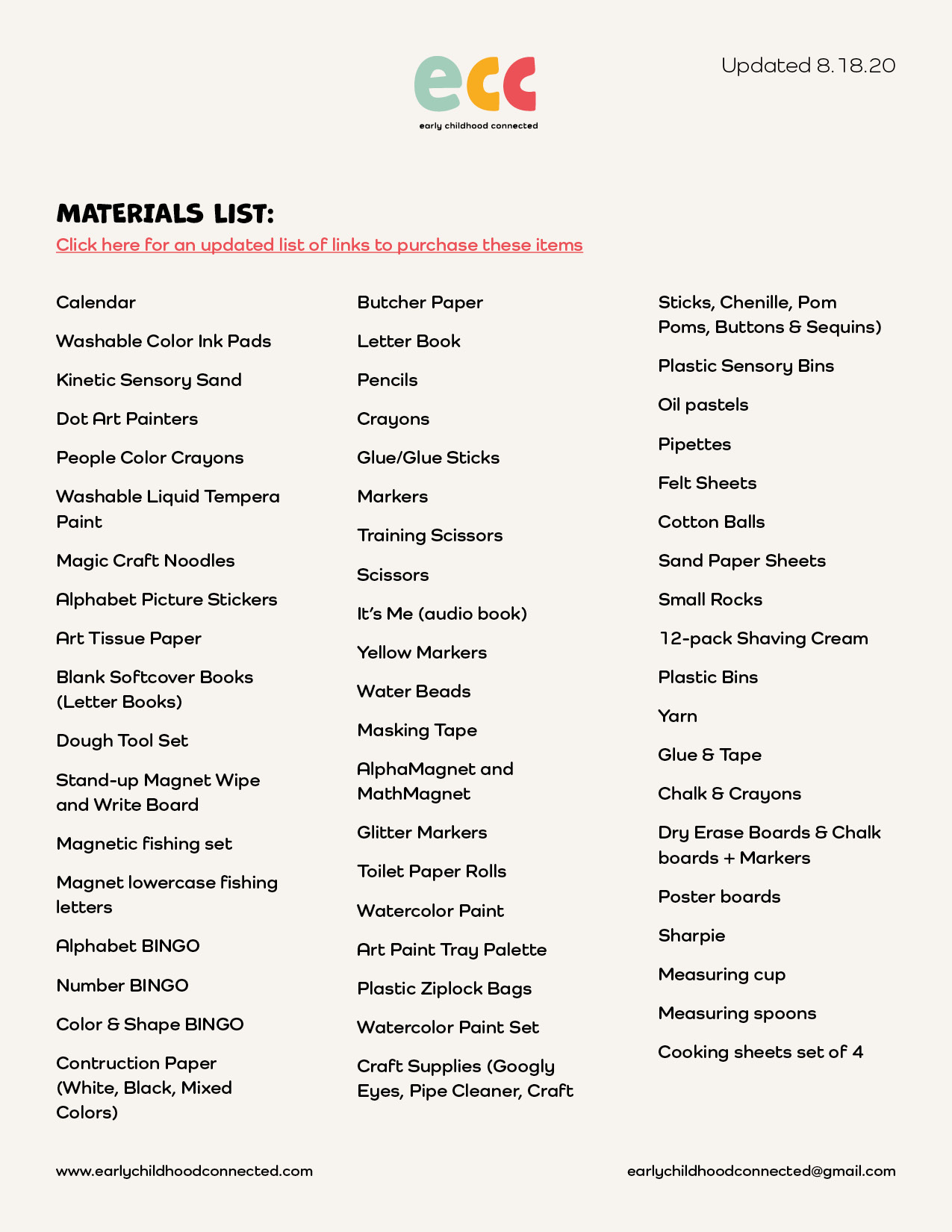 Early Childhood Connected is a 36-week program designed for young learners ages 2-5. ECC is influenced by Reggio Emilia, Montessori, Howard Gardner’s theory of multiple intelligences and play based philosophies. The curriculum covers math, science, literacy, art and movement with an emphasis on social emotional skills and mindfulness.